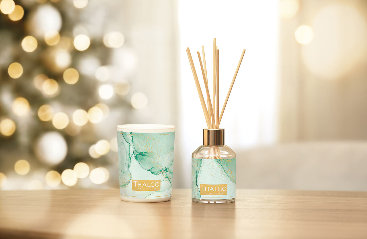 Kolekcja świąteczna Thalgo 2025! Zapraszamy do doświadczenia chwil dobrego samopoczucia w domu, w kojącej atmosferze inspirowanej światem morskim. Każda kreacja, łącząca w sobie świeżość morskiego powietrza i kojącą miękkość, przywołuje sztukę życia Riwiery Francuskiej. Ta limitowana edycja świecy uwalnia jasne, rewitalizujące nuty morskie, wypełniając dom światłem.